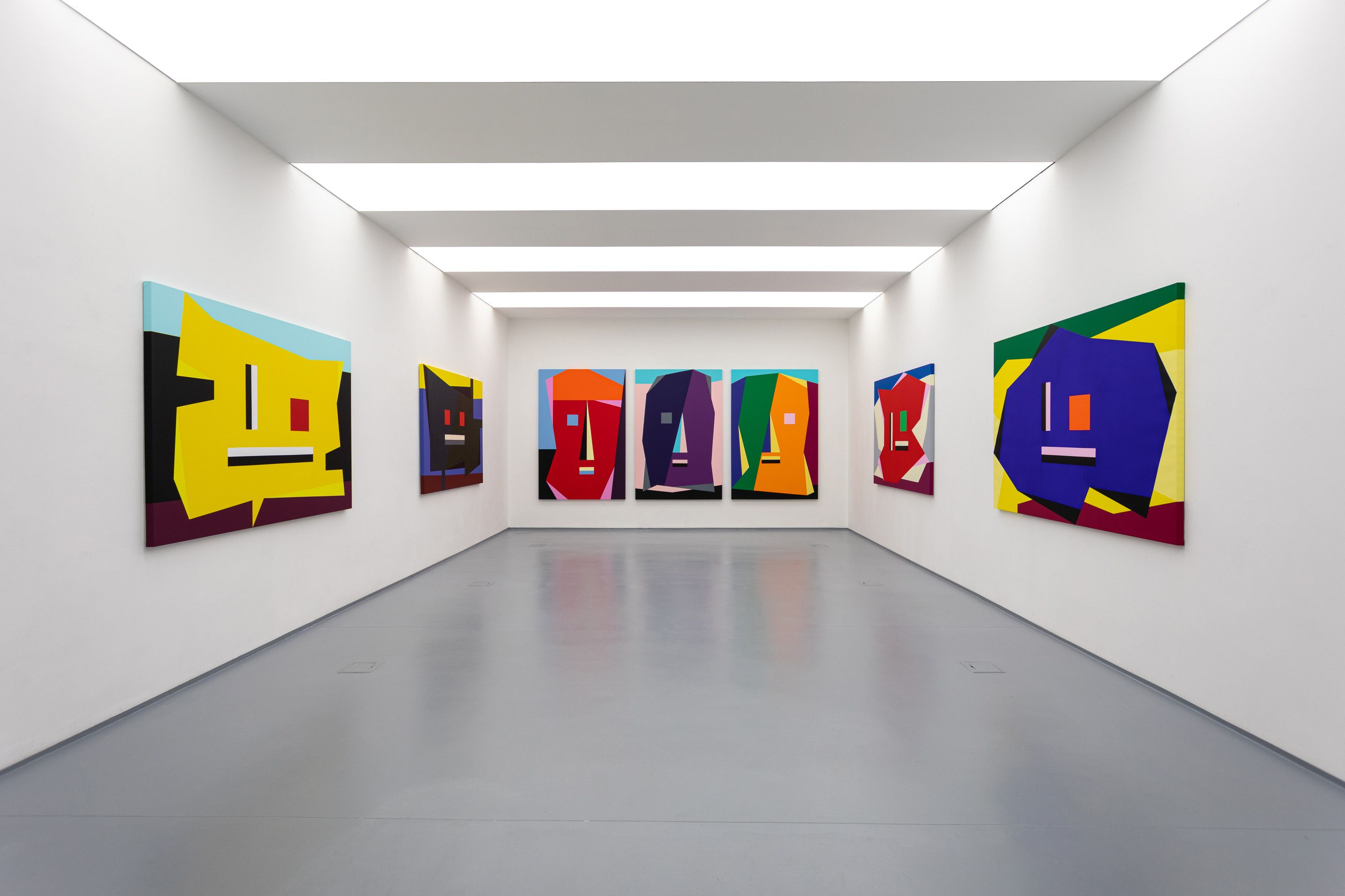 The new paintings of Bak transmit the ever faster changing conditions of our reality, and makes the audience think about the consequences. The restlessly curious artist still challenges himself to find new ways for his painting practice, he also creates links back to earlier parts of his oeuvre. The actual Situation paintings could be interpreted as a way of expanding the the possibilities of geometric abstraction, and as a way to destillate digital image culture, in which even such an archetype as the human face is redefined.