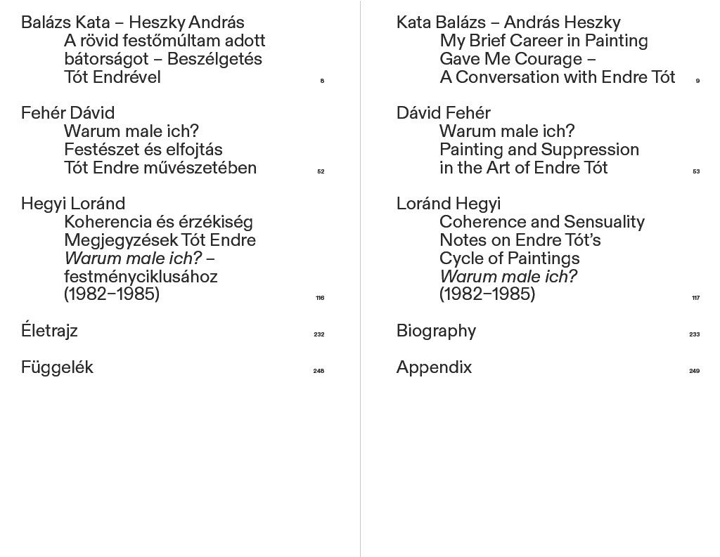 Az acb Galéria ebből a dinamikus gesztusokkal létrehozott, a nyolcvanas évek vad festészetének hatását magán viselő sorozatból mutatott be művészettörténeti különlegességnek számító válogatást. A Warum male ich? címet viselő kiállítás a festő Tót Endrét helyezte a középpontba: azt az alkotót, akinek a fogalmi művészettel összeforrt pályáján is meghatározóak maradtak a festészet elméleti és gyakorlati kérdései, sőt az azokkal való küzdelem, ahogy azt a hetvenes évek elején a Meg nem festett képeim vagy Night Visit to the National Gallery című művészkönyvei, majd a Távollévő képek, a Blackout képek, illetve a 2019-ben szintén az acb Galéria által újrafelfedezett Layout képek is tanúsítják. Tót gesztusalapú korai művei, amelyekkel a legendás 1968-as IPARTERV kiállításon is részt vett, a nagyfokú festőiség, az absztrakt expresszionizmus, az informel, a kalligráfia jegyében születtek, majd a hatvanas évek végén és az évtized fordulóján a tárgyilagos, sokszor pop artos hard-edge-en, minimalista alkotásokon keresztül vezetett útja a vászon kiüresítéséhez, a médiummal való szakításhoz, egyúttal a konceptuális művészethez. A „Zéró” és „Semmi” konceptjei mail art művekben, utcai demonstrációkon, fotóperformanszokon, gépeléseken, pecsételéseken, ofszet munkákon és művészkönyvekben jelentek meg, nem ritkán festészeti referenciákon keresztül.